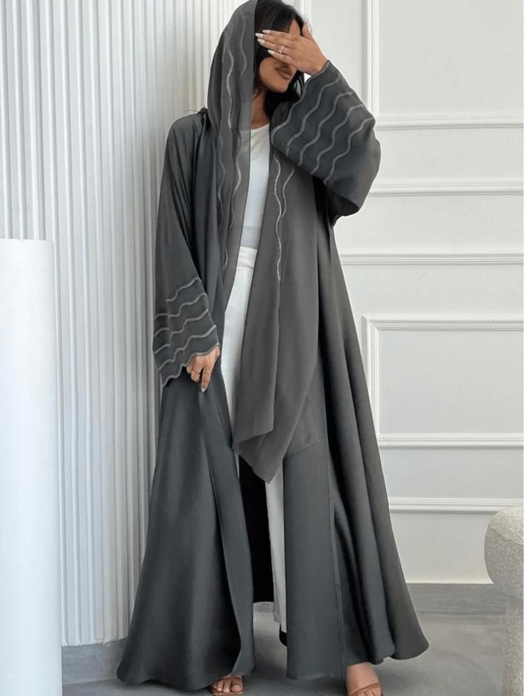 اكتشفي أناقتك مع عباية قطعتين رمادية مع تطريز مخطط